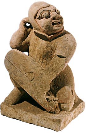 圆雕,镇墓武士。头戴兜鍪,身穿铠甲,左手执盾,右手抚于脑后,面向左侧,双目外突,高鼻,阔口;铠甲上用黑彩绘出细密的鱼鳞纹代表甲片,盾牌饰几何纹,塑型夸张、尽显威严。大同北魏墓以陶质镇墓武士俑最为多见,石质镇墓武士出土较少。