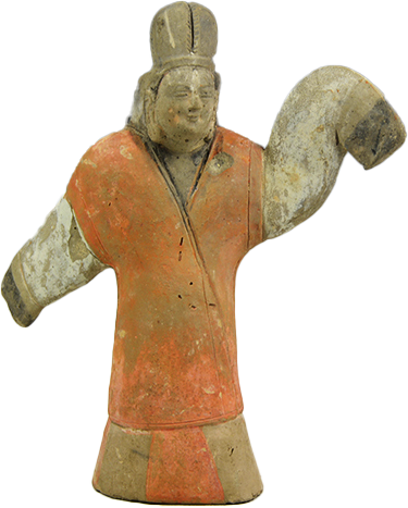 泥质灰陶,头戴垂裙皂帽,面目圆润,五官清秀,耳有饰物,内着白色长褥,外披一件红色左祍半臂,长裙曳地。左手在前,将长袖舒展扬起,右手在后,将长..